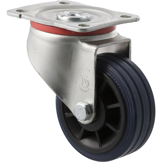 Medium industrial blue rubber castor. General use including warehouse trolleys, engineering, transport and staging.