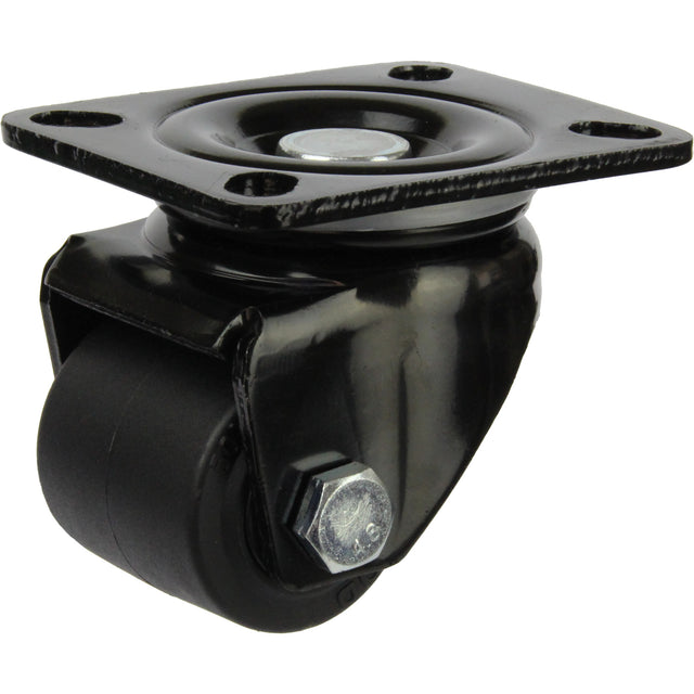Medium Industrial decorative castor with a powder coated black finish, wheel is black nylon. Suitable applications include furniture, displays, shop fittings, road cases etc.