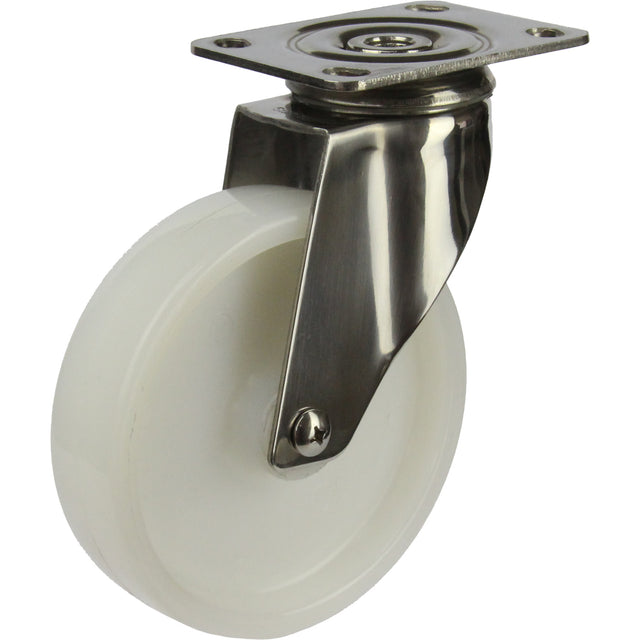 Economy - Light industrial stainless steel white nylon castor. General use including food trolleys, wet areas, medical, pharmaceutical and corrosive environments.