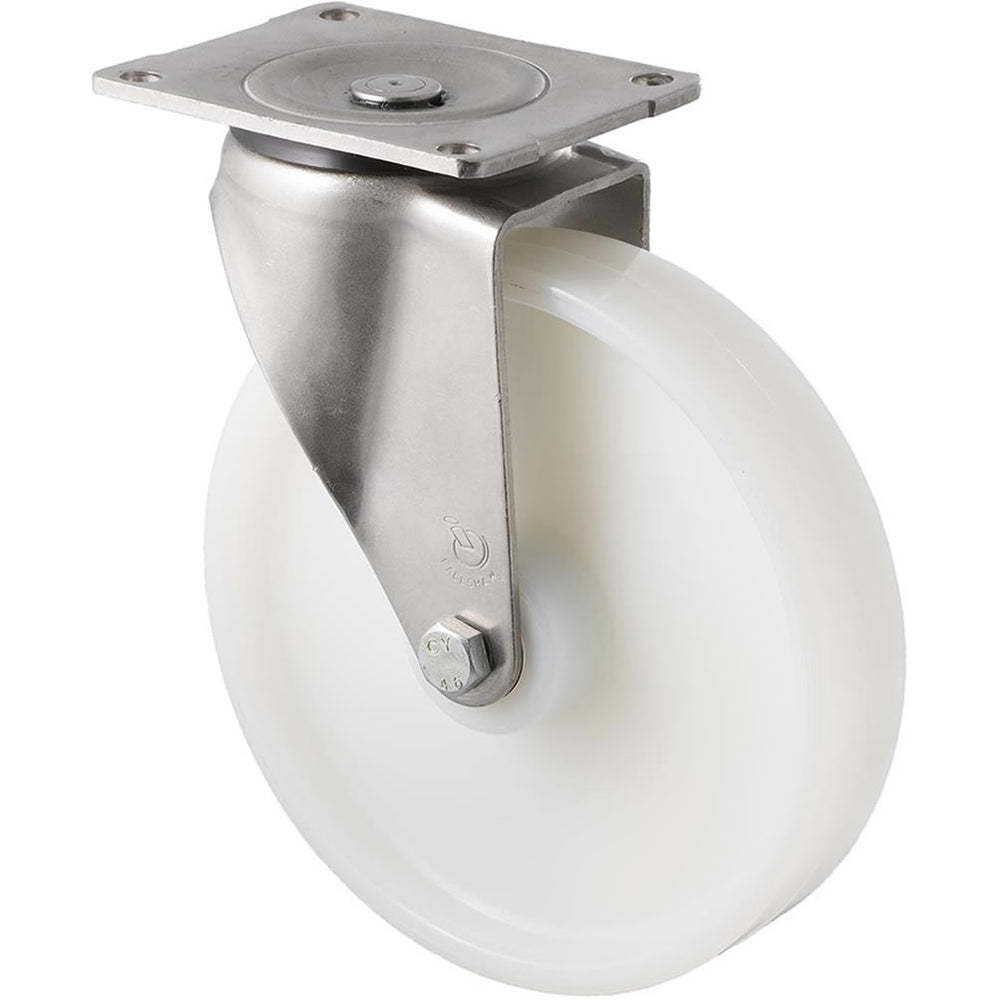 Heavier industrial stainless steel white nylon castor. General use including food trolleys, wet areas, pharmaceutical and corrosive environments.