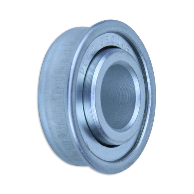 Un-ground deep groove ball bearing with flanged, pressed metal housing.