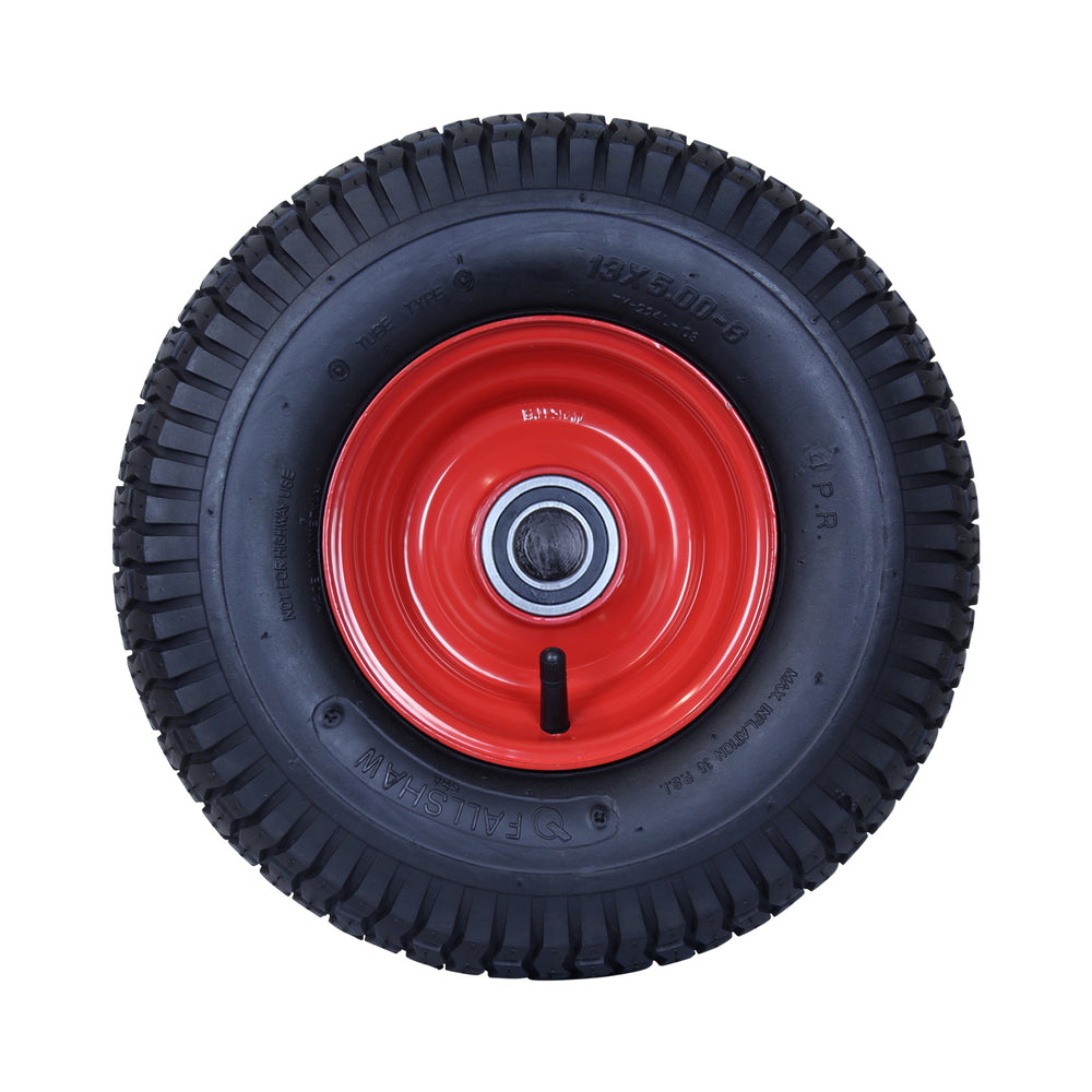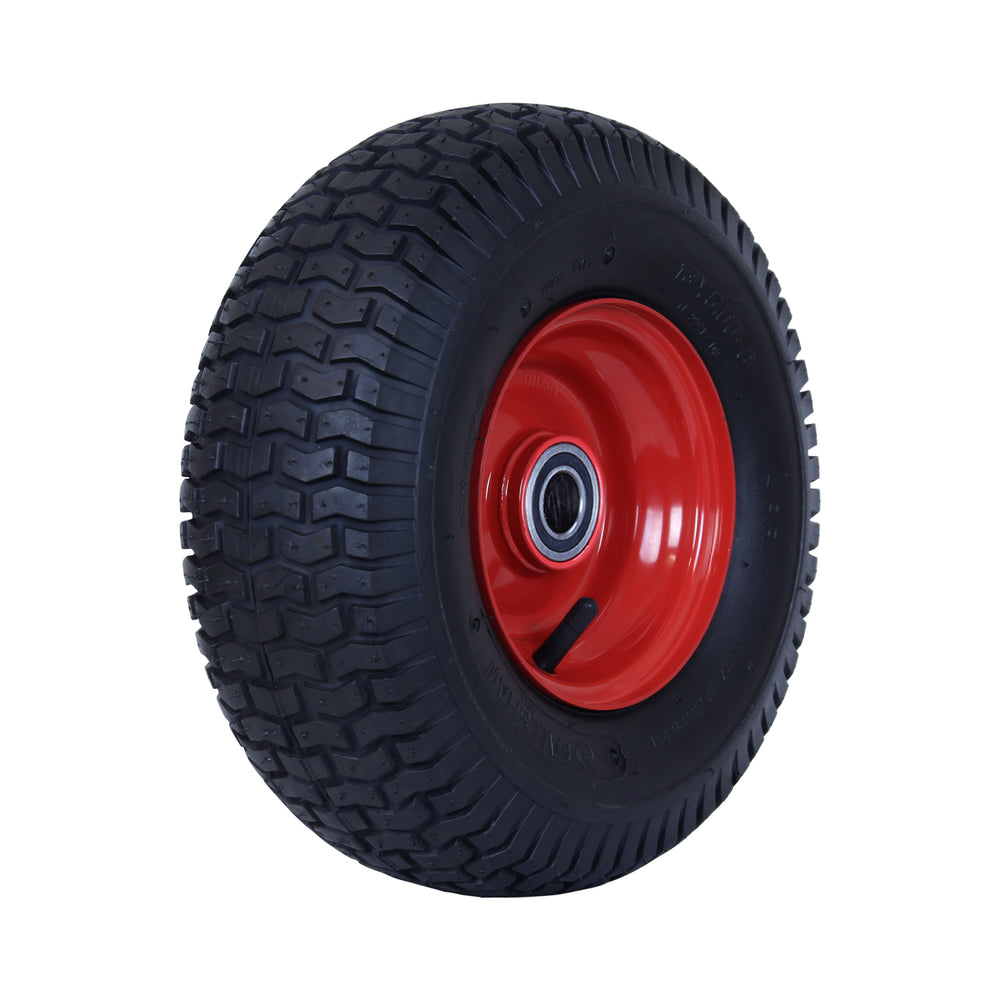 Black rubber, steel centred pneumatic wheel, tube type, single piece rim, sealed ball bearings.
