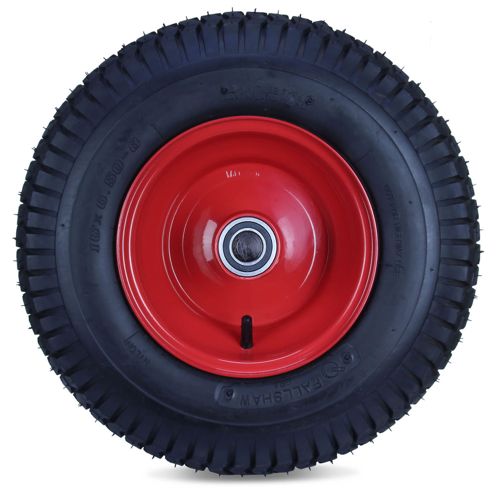Black rubber, steel centred pneumatic wheel, tube type, single piece rim, sealed ball bearings.