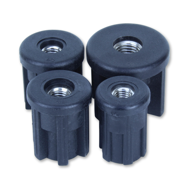 Round threaded tube insert to suit mounting adjustable/levelling feet. Glass filled nylon for high strength, stainless steel thread.