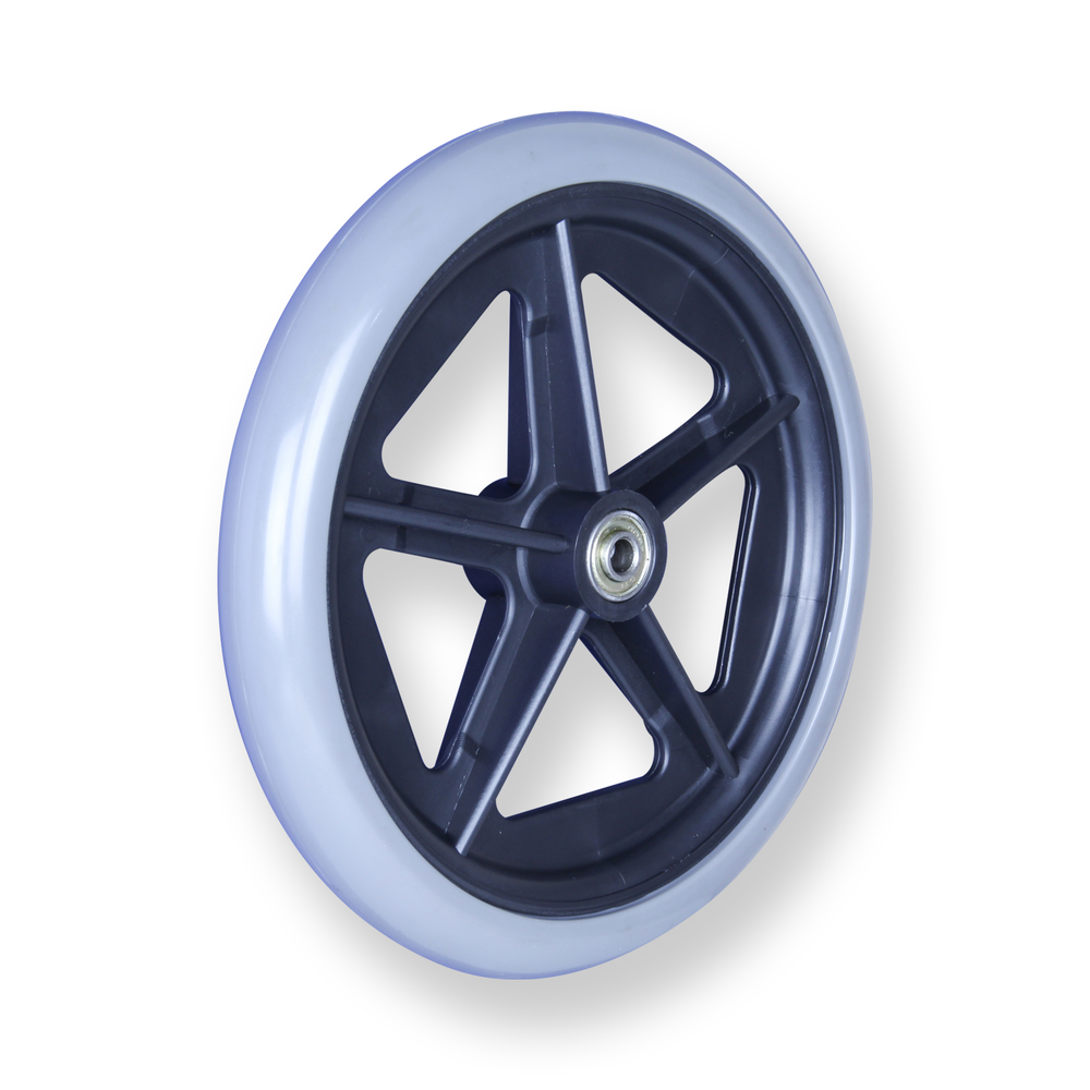 Wheelchair replacement wheel, grey non-marking tyre on plastic centre.